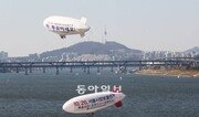 서울시장 보궐선거 전날인 25일 한강 상공에 서울시 선거관리위원회가 유권자의 투표 참여를 독려하기 위해 띄운 선거 홍보 무인비행선 2대가 날고 있다. 장승윤 기자 tomato99@donga.com}