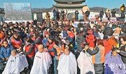 16일 경기 포천시민 200여 명이 서울 광화문광장에서 지하철 7호선을 포천까지 연장하는 사업의 예비타당성 조사를 면제해 달라며 삭발을 하고 있다. 이들은 이날 ‘경기 포천 지역 지하철 7호선 연장 촉구 집회’를 열고 지하철 연장 사업의 국가균형발전사업 선정도 요구했다. 송은석 기자 silverstone@donga.com}
