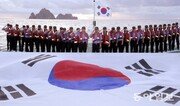 광복절을 이틀 앞둔 13일 경북 울릉군 동해상에서 3000t급 경비함인 동해해경 3007함 대원들이 대형 태극기를 펼치고 독도 수호를 다짐하며 경례하고 있다. 대원들 뒤로 멀리 독도의 모습이 보인다. 독도=박영철 기자 skyblue@donga.com}