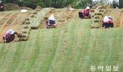 23일 전남 장성군 동화면의 조경용 잔디 재배농장에서 주민들이 묘소와 조경용으로 사용하는 잔디 수확 작업을 하고 있다. 박영철 기자 skyblue@donga.com}