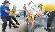 5일 전북 군산시 비응항에서 열린 실족사고 대비훈련에 참가한 군산해경 비응파출소 직원 등이 대형 파도방지용 구조물에서 사다리와 로프를 이용해 인명구조 훈련을 하고 있다. 박영철 기자 skyblue@donga.com}
