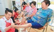 어르신을 위한 한방 수지침 치료와 발마사지 봉사활동이 8일 광주 북구 일곡동 금호어울림 경로당에서 열렸다. 지역 통장단과 북구의회 의장이 어르신들에게 발마사지를 해드리고 있다. 박영철 기자 skyblue@donga.com}