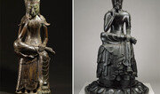 깊은 사색에 잠긴 미륵보살의 미소가 은은하게 번진다. 오른손 손가락을 뺨에 댄 채 한쪽 다리를 무릎 위에 올린 도상이 서로 닮았다. 6∼7세기 제작된 한국과 일본의 반가사유상은 불교문화 교류의 한 단면을 보여 주는 대표적인 문화재다. 우리나라 금동반가사유상(국보 78호)과 일본 국보인 나라 주구(中宮) 사 소장 목조반가사유상이 국립중앙박물관에 함께 전시된다. 주구 사 반가사유상이 해외에서 전시되는 것은 처음이다. 양국 최고(最高)의 반가사유상을 한자리에서 볼 수 있는 흔치 않은 기회다. 국립중앙박물관은 지난해 한일 국교정상화 50주년을 맞아 기획한 ‘한일 국보 반가사유상의 만남’ 특별전을 다음 달 24일부터 개최한다고 20일 밝혔다. 인도에서 유래된 반가사유상은 중앙아시아와 중국을 거쳐 한국, 일본에 전해졌다. 6세기에 만들어진 국보 78호 반가사유상은 7세기 아스카시대에 제작된 일본 주구 사 반가사유상보다 시기적으로 앞선다. 두 작품은 6월 12일까지 국내에서 전시된 뒤 일본 도쿄국립박물관에서도 6월 21일부터 7월 10일까지 선보인다. 02-2077-9540김상운 기자 sukim@donga.com}