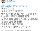문재인 대통령은 8일 조 바이든 대통령 후보와 카멀라 해리스 부통령 후보가 미 대선에서 승리한 데 대해 “우리 공동의 가치를 위해 두 분과 함께 일해 나가기를 고대한다”며 “같이 갑시다!”라고 밝혔다. ‘같이 갑시다’는 버락 오바마 행정부 시절부터 한미동맹 구호로 자주 사용해온 표현이다. 문 대통령은 이날 트위터에 “우리의 동맹은 강력하고 한미 양국 간 연대는 매우 견고하다”며 “두 분과 함께 열어나갈 양국관계의 미래 발전에 기대가 매우 크다”고 강조했다. 영어로도 같은 내용을 올렸고 “같이 갑시다” 대목을 소리 나는 대로 “Katchi Kapshida!”라고 썼다. 문 대통령의 트위터 축하 메시지는 바이든 당선인이 성명을 통해 사실상 승리를 선언한 지 8시간 만에 나왔다. 문 대통령이 성명서, 축전 등 공식 외교수단이 아닌 소셜네트워크서비스(SNS) 메시지를 올린 것은 도널드 트럼프 미 대통령이 대선 결과에 승복하지 않고 있는 점 등을 감안한 것으로 보인다. 문 대통령은 축하 메시지에 ‘당선’이라는 단어도 쓰지 않았다. 일본 영국 독일 프랑스 등 주요국 정상들도 트위터를 통해 축하 메시지를 보냈다. 한편 문 대통령의 방미는 바이든의 취임(내년 1월 20일) 이후가 될 가능성이 큰 것으로 알려졌다. 박효목 기자 tree624@donga.com}