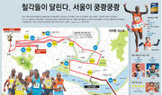 “2시간5분37초, 넘을 수 있다.” 15일 열리는 2015서울국제마라톤대회 겸 제86회 동아마라톤대회 기자회견이 개최된 13일 서울 올림픽파크텔. 2012년 국내 개최 사상 처음 2시간5분대의 대회신기록을 세우며 우승한 윌슨 로야나에 에루페(27·케냐)와 지난해 챔피언 야코브 자르소 킨트라(27·에티오피아)는 “훈련을 잘 소화했고 컨디션도 좋기 때문에 좋은 기록을 낼 수 있다”고 자신했다. 에루페는 2012년 말 말라리아 예방접종 주사를 맞은 가운데 국제육상경기연맹(IAAF) 불시 검사에서 도핑 양성반응이 나와 2년 자격정지 징계를 받았다가 올 1월 말 풀렸다. 에루페는 “2년 동안 서울에서 세운 개인 최고기록을 깨기 위해 훈련에 전념했다”며 자격정지 뒤 첫 레이스에서 큰일을 내겠다고 자신했다. 지난해 2시간6분17초의 개인 최고기록을 세우며 우승한 킨트라도 “지난해 말부터 체계적으로 이번 대회를 준비했다”며 대회기록 경신에 욕심을 보였다. 1997년 권은주가 세운 2시간26분12초의 여자 한국기록 경신에 도전하는 김성은(26·삼성전자)은 “기록 경신에 대한 욕심보다는 내가 더 발전하는 기회로 삼겠다”고 말했다. 2013년 서울국제마라톤에서 2시간27분20초의 개인 최고기록을 세운 김성은은 “지난해 말부터 체력과 근지구력을 키우는 등 훈련방식을 바꿔 체계적으로 훈련했다”며 자신감을 보였다. 2013년 이후 2년 만에 다시 서울을 찾은 ‘공무원 마라토너’ 가와우치 유키(28·일본)도 “서울에서 세운 2시간8분14초의 개인 최고기록을 깨겠다”고 말했다. 한편 마스터스 풀코스 참가자들은 약 33km 지점인 신양초교 교차로에서 서울챌린지 10K 참가자와 만난다. 풀코스는 잠실대교 방향으로 왼쪽 1.5개 차로, 10K는 오른쪽 1.5개 차로로 1.5km를 달린 뒤 합쳐진다.양종구 기자 yjongk@donga.com}