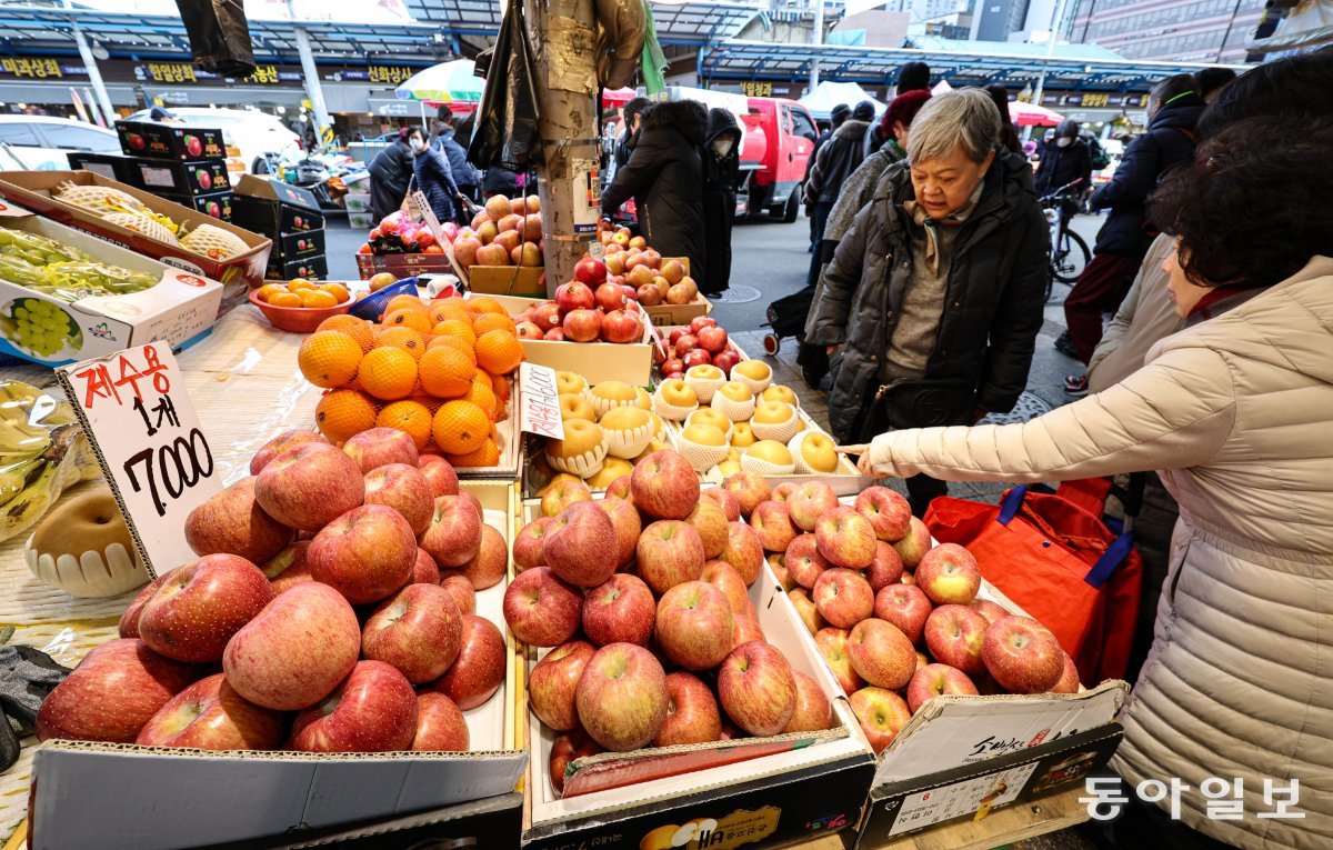 설 연휴를 일주일 앞둔 2일 서울 동대문구 청량리청과물시장에서 한 소비자가 제수용 과일을 고르고 있다. 제수용 사과는 개당 7000원에 판매되고 있다. 통계청에 따르면 지난달 사과값은 1년 전보다 56.8% 올랐다. 이한결 기자 always@donga.com}