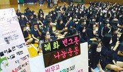 15일 서울 강북구 혜화여고 강당에서 이 학교 학생 300여 명이 점심 한 끼를 안 먹는 기아 체험 ‘혜화 빈 그릇 나눔운동’을 하고 있다. 메르스 여파로 마스크를 착용한 학생들이 아프리카 어린이들의 기아 실태를 알리는 영상을 보고 있다. 신원건 기자 laputa@donga.com}