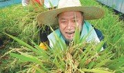 23일 경기 이천시의 한 비닐하우스에서 올해 첫 벼 베기 행사에 참여한 농부가 볏단을 들어 보이며 활짝 웃고 있다. 2월 국내에서 첫 모내기를 한 이 쌀은 다섯 달 만에 수확한 것으로 ‘임금님표 이천쌀’ 브랜드로 포장해 사회 각계에 전달한다. 이천=신원건 기자 laputa@donga.com}