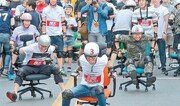 28일 서울 서대문구 연세로에서 열린 ‘의자 레이싱’에 참가한 시민들이 헬멧을 쓰고 의자에 앉아 경주를 벌이고 있다. 한 의자 제조업체가 마련한 행사로 개인전 우승자에게는 60만 원 상당의 고급 의자가 상품으로 수여됐다. 신원건 기자 laputa@donga.com}