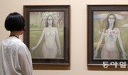 28일 서울 중구 서울시립미술관에서 한 관람객이 천경자 1주기 추모전에 걸린 그림 ‘여인의 시 1’(1984년·왼쪽)과 ‘여인의 시 2’(1985년)를 살펴보고 있다. 천 화백의 ‘미인도’ 위작 논란 사건을 수사 중인 검찰은 이 두 그림 등 전시작품 5점을 26일 떼어가 조사한 뒤 이날 반환했다. 양회성 기자 yohan@donga.com}