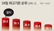 24일 올여름 들어 처음으로 수은주가 40도를 넘어섰다. 이날 오후 3시 27분 경북 영천시 신녕면, 오후 4시 11분 경기 여주시 흥천면의 최고기온이 각각 40.3도를 기록했다. 2016년 8월 12일 경북 경산시 하양읍이 40.3도를 기록한 이후 2년 만이다. 하양읍은 전날 39.9도로 올해 최고 기록을 세웠는데 하루 만에 이 기록이 깨졌다. 다만 이 기온은 읍면동 단위에 설치된 자동관측기기(AWS)가 측정한 것이어서 공식 기록으로 남지 않는다. 한 도시의 공식 기온은 유인관측소에서 측정한다. 지금까지의 공식 최고기온은 1942년 8월 1일 대구에서 기록한 40.0도다. 24일 공식 최고기온은 경북 의성의 39.6도였다. 대구와 경북 포항은 23일 밤까지 12일째 열대야가 이어졌다. 경북에선 24일까지 닭과 오리 17만4111마리와 돼지 2415마리 등 가축 17만6526마리가 폐사했다. 일 최고기온이 33도를 넘는 폭염일수는 전국 평균 10.4일로 이미 2015년 여름 전체 폭염일수(10.1일)를 뛰어넘었다. 바다도 펄펄 끓고 있다. 해양수산부 국립수산과학원은 24일 오전 △경남 통영시 학림도∼전남 고흥군 거금도 △전남 영광군 안마도∼해남군 갈도 △제주 연안 해역에 ‘고수온주의보’를 발령했다. 고수온주의보는 수온이 28도에 이르렀거나 이를 것으로 예측될 때 발령된다. 전남 고흥군∼경남 남해군 해역에는 올해 첫 적조주의보가 내려졌다.이미지 image@donga.com·주애진 / 영천=박광일 기자}