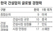한국 건설업의 글로벌 경쟁력이 22개 주요국 가운데 9위로 평가되며 중위권에 랭크됐다. 가격경쟁력과 시장성장성 등에서는 높은 평가를 받았지만 설계경쟁력은 조사 대상국 중 최하위권에 머물렀다. 국토해양부는 국내 건설업의 글로벌 경쟁력을 객관적으로 평가하기 위해 ‘건설산업 글로벌 경쟁력 평가모델’을 개발하고, 이 모델에 따라 22개 주요 국가를 평가한 결과 한국이 9위를 차지했다고 15일 밝혔다. 한국건설기술연구원이 주도해 마련한 건설산업 글로벌 경쟁력 평가지표는 ‘건설인프라 경쟁력 평가지표’와 ‘건설기업역량 평가지표’로 구성됐다. 건설인프라 경쟁력 평가지표는 크게 건설인프라와 건설기업역량으로 나뉜다. 건설인프라는 건설시장 규모, 건설시장 성장률, 시장 안정성, 건설 리스크 등 4개 항목으로 구성되며 국가가 만드는 제도나 정책, 사회구조 등을 종합평가한 것이다. 건설기업역량 평가지표는 시공경쟁력, 설계경쟁력, 가격경쟁력지표 등 3개 항목으로 이뤄졌으며 건설사들의 경영능력과 성과를 나타낸다. 평가 결과에 따르면 미국이 건설인프라와 건설기업역량에서 모두 1위를 차지하며 종합평가 1위에 올랐다. 미국은 건설리스크와 설계경쟁력에서 1위에 랭크됐고, 가격경쟁력(20위)을 뺀 나머지 평가세부항목에서 모두 10위권 이내에 들었다. 중국 이탈리아 영국 독일이 2∼5위를 차지했고, 이어 프랑스 네덜란드 호주 등의 순이었다. 한국은 가격경쟁력에서 중국과 인도에 이어 3위에 올랐고, 건설리스크(8위)와 시장성장률(7위)도 비교적 양호한 것으로 평가됐다. 하지만 건설부패 인식과 같은 시장안정성은 17위, 설계분야의 기술경쟁력은 19위로 최하위권에 머물렀다. 황재성 기자 jsonhng@donga.com}