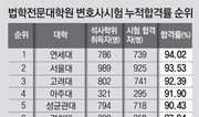 전국 25개 법학전문대학원(로스쿨) 가운데 변호사시험 누적 합격률이 가장 높은 학교는 연세대(94.02%)로 조사됐다. 법무부는 22일 로스쿨별 1∼7회 변호사시험(2012∼2018년) 변호사시험 연도별 합격률과 누적 합격률을 공개했다. 변호사시험 누적 합격률 2, 3위는 서울대(93.53%), 고려대(92.39%)였다. 변호사시험 합격률은 변호사시험 합격자 수를 대학원 로스쿨 학위 취득자(졸업시험 통과자)로 나눈 비율이다. 변호사법은 로스쿨에서 학위를 취득한 사람에게만 변호사시험 응시 자격을 주고 있다. 누적 합격률 90%를 넘긴 학교는 연세대, 서울대, 고려대를 포함해 아주대(91.90%), 성균관대(90.43%) 등 모두 5곳이다. 7년간 누적 합격률이 가장 낮은 학교는 원광대로 62.60%에 그쳤다. 제주대(67.78%) 동아대(67.82%) 전북대(69.62%)도 60%대의 저조한 성적을 기록했다. 전체 25개 로스쿨의 평균 누적 합격률은 83.10%로 집계됐다. 학교별 변호사시험 합격률 편차는 해를 거듭할수록 벌어지는 추세다. 변호사시험이 처음 실시된 2012년에는 1위 경희대, 아주대(이상 100%)와 최하위 충북대(63.33%)의 격차가 36.67%포인트였다. 반면 올해 치러진 제7회 시험에서는 1위 서울대(78.65%)와 최하위 원광대(24.63%)의 합격률 차이가 54.02%포인트였다. 이날 합격률 공개는 법무부가 대한변호사협회의 요구를 받아들여 이뤄졌다. 대한변협은 지난해 6월 법무부를 상대로 “각 로스쿨의 제6회 변호사시험(2017년 실시) 합격률을 공개하라”며 정보공개거부처분 취소 청구소송을 냈다. 법무부는 지난달 22일 서울고법에서 열린 항소심에서 패소하자 대법원 상고를 포기했다. 법무부는 법원 판결 취지를 감안하고 로스쿨 입학 지원자들에게 정확한 정보를 제공하기 위해 각 로스쿨의 변호사시험 연도별 합격률과 누적 합격률을 모두 공개했다. 김현 대한변협 회장은 “합격률이 현저히 낮은 학교들을 우선 대상으로 로스쿨을 통폐합해 교육의 질을 높여야 한다”고 주장했다.정성택 기자 neone@donga.com}
