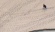프랑스 북서쪽 노르망디 해변의 작은 섬인 몽생미셸의 수도원을 찾은 연인이 바닷물이 빠져 드러난 성곽 밖 갯벌을 거닐고 있다. 앞서 다른 여행객들이 거닐던 발자국이 바닥에 선명하게 찍혀 있다. 양회성 기자 yohan@donga.com}