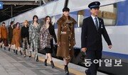 8일 서울역에서 열린 ‘서울365―서울역 겨울여행 패션쇼’에서 한병근 서울역장(앞)과 모델들이 플랫폼을 런웨이 삼아 걷고 있다. 디자이너 정두영, 유혜진 씨가 겨울 여행에 어울리는 옷들을 선보였다. 김재명 기자 base@donga.com}