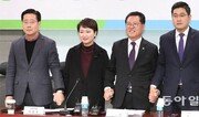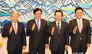 정세균 국회의장과 여야 3당 원내대표가 27일 국회 회동에서 “예산안을 기한 내에”라고 외치며 포즈를 취하고 있다. 왼쪽부터 국민의당 김동철 원내대표, 더불어민주당 우원식 원내대표, 정 의장, 자유한국당 정우택 원내대표. 김재명 기자 base@donga.com}