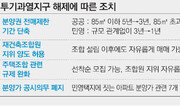 22일부터 서울 강남, 서초, 송파구 등 강남 3구가 투기과열지구에서 풀려난다. 이에 따라 이들 지역에서 재건축 조합원 자격을 자유롭게 매매할 수 있다. 또 민영아파트의 전매제한 기간이 3년에서 1년으로 단축되고, 주택조합은 조합원을 선착순으로 모집할 수 있다. 국토해양부는 ‘12·7 주택시장 정상화와 서민 주거안정 지원 방안’의 후속조치로 강남 3구에 대한 투기과열지구 지정을 해제한다고 21일 밝혔다. 이번 조치는 22일 관보에 게재되면 즉시 효력이 발생한다. 이번 조치로 2002년 9월 부동산 투기심리 차단을 목적으로 도입됐던 투기과열지구는 한 곳도 남지 않게 된다. 투기과열지구는 주택가격상승률이 물가상승률보다 현저히 높고 청약경쟁률 등을 고려할 때 투기 우려가 있다고 판단되는 지역에 대해 국토부 장관이 지정한다. 이에 따라 강남 3구의 분양권 전매제한 기간이 공공택지에서 분양되는 85m²(전용면적 기준) 이하 아파트는 5년에서 3년으로, 85m² 초과는 3년에서 1년으로 줄어든다. 민간택지에서는 규모에 상관없이 3년에서 1년으로 짧아진다. 이번 조치로 가장 수혜를 볼 곳은 내년 하반기부터 위례신도시에서 분양될 아파트들이다. 국토부에 따르면 송파구 지역에 포함된 위례신도시 내 민영아파트는 1900여 채다. 재건축 조합 설립 이후에도 조합원 지위를 자유롭게 팔고 살 수 있다. 강남구에서는 △개포동 주공1단지 △논현동 경복 △대치동 청실 △압구정동 한양7차 △청담동 청담삼익 △역삼동 개나리 4, 5, 6차 등이 수혜대상이다. 서초구에서는 △방배동 3, 5, 6구역 △잠원동 신반포 5, 6, 18차 △서초동 서초삼호1차·우성2차, 송파구에서는 △송파동 반도 △가락동 가락시영 등이 혜택을 볼 것으로 전망된다. 황재성 기자 jsonhng@donga.com}