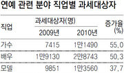 한류 열풍이 거세지고 관련 연예 산업이 급성장하면서 연예계 종사자가 1년 새 40% 가까이 증가했다. 하지만 인원이 급증하면서 1인당 수입은 크게 줄고 있는 것으로 나타났다. 25일 국세청이 발간한 국세통계연보에 따르면 월급 등 고정급여를 받지 않고 프리랜서로 활동하는 사업소득자가 2010년 기준 373만8637명으로 2009년(340만3714명)보다 9.8% 늘었다. 같은 기간 근로소득을 신고해야 하는 봉급생활자(1429만4993명→1517만6782명)는 6.2% 증가하는 데 그쳤다. 프리랜서 사업자 중에는 한류 바람에 힘입어 대중문화 종사자가 큰 폭으로 증가했다. 연예 관련 종사자는 지난해 17만2095명으로 2009년(12만4372명)보다 38%나 급증했다. 특히 한류 열풍을 주도하고 있는 가수는 지난해 1만1490명으로 전년(7415명)보다 무려 55% 늘었다. 배우도 전년보다 50% 이상 급증하면서 2만8743명에 이르렀고, 이어 모델(37.7%) 연예보조(35.6%) 작곡가(26.6%) 등도 모두 30% 안팎의 높은 증가율을 보였다. 한편 자유직업인의 1인당 연평균 소득은 2009년 1165만 원에서 지난해 1212만 원으로 4% 증가하는 데 그쳤다. 특히 대중문화 관련 종사자들은 인원이 급증한 탓에 소득이 모두 전년보다 크게 줄었다. 배우의 경우 2009년 1729만 원에서 지난해 1377만 원으로 20.4%나 감소했다. 이어 가수가 848만 원(―11.8%), 작곡가 639만 원(―11.3%), 연예보조 443만 원(―8.3%)으로 모두 전년보다 수입이 줄었다. 황재성 기자 jsonhng@donga.com}