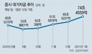 장중 큰 변동 폭을 보이던 코스피가 사흘 만에 소폭 반등했다. 단기 조정에 대한 불안감이 커지면서 하루 종일 ‘눈치 보기’ 장세가 이어졌다. 급등하던 증시가 숨고르기에 들어간 가운데 증시 대기자금은 연일 사상 최고치를 경신하고 있다. 13일 코스피는 22.34포인트(0.71%) 오른 3,148.29에 거래를 마쳤다. 이날도 장중 3,109대까지 떨어졌다가 오후 들어 1% 이상 뛰는 등 하루 변동 폭이 약 55포인트로 컸다. 다만 11일(170포인트)과 12일(107포인트)에 비해선 출렁임이 덜했다. 개인과 외국인이 각각 1691억 원, 1886억 원어치를 사들였다. 반면 기관은 홀로 3725억 원을 팔아치우며 4거래일 연속 매도세를 보였다. 3거래일 만에 코스피가 상승했지만 여전히 단기 조정 가능성은 열려 있다는 지적이 나온다. 서상영 키움증권 투자전략팀장은 “미국 금리 상승 속도가 더 빨라지면 시장 변동성은 다시 커질 수 있다”고 진단했다. 미국 장기 국채 금리(10년물 기준)는 11일 연 1.15%로 1주일 만에 0.22%포인트 급등했다. 미국 국채 10년물 금리가 계속 오르면 주식시장 상승세에 제동이 걸릴 것이라는 분석이 많다. 다만 외국인들이 3거래일 만에 ‘사자’로 돌아선 것은 긍정적으로 평가된다. 외국인은 이날 LG화학(3.95%), SK하이닉스(3.10%), 네이버(3.29%) 등을 주로 샀다. 이효섭 자본시장연구원 금융산업실장은 “외국인들이 한국 글로벌 기업들의 성장성을 높게 보고 있다”며 “세계 증시가 무너지지 않는다면 외국인 수급은 긍정적일 것”이라고 했다. 증시 대기자금인 투자자 예탁금은 연일 사상 최대치를 다시 쓰고 있다. 12일 현재 투자자 예탁금은 74조4559억 원으로 집계됐다. 11일 사상 처음으로 72조 원을 넘어선 뒤 하루 만에 2조1347억 원이 늘었다. 김지산 키움증권 리서치센터장은 “신규 계좌가 매일 대규모로 개설되며 ‘머니 무브’가 일어나고 있다”며 “대기자금이 장중 하락 폭을 줄이는 역할을 하고 있다”고 했다. 실제로 새해 들어 1주일 동안 삼성증권 한 곳에서만 새로 늘어난 고객은 4만 명에 이른다. 지난해 1월 신규 고객의 2배 수준이다. 고액 자산가들은 주가 상승에 ‘베팅’하고 있다. 삼성증권에 따르면 예탁자산 10억 원 이상인 자산가들은 4∼8일 국내 증시에서 ‘코덱스(KODEX) 레버리지’를 가장 많이 사들였다. 이 종목은 코스피200지수가 오르면 상승분의 2배만큼 수익을 얻는 상품이다. 새해 첫 주 코스피가 3,000 선을 돌파하자 주가가 더 오를 것이라고 전망한 자산가들이 많았다는 의미다. 4일 종가에 코덱스 레버리지를 샀다면 13일 현재 수익률은 15.1%다. 지난해와 2019년 1월 매수 1위 종목이 ‘코덱스(KODEX)200 선물인버스2X’였던 점과도 대조적이다. 일명 ‘곱버스’로 불리는 이 종목은 주가가 떨어질 때 하락 폭의 2배(곱하기)로 수익을 올리도록 설계된 상품이다.박희창 기자 ramblas@donga.com}