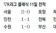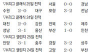 올 시즌 도중 전남에서 포항으로 유니폼을 갈아입은 신영준이 친정 팀 전남에 비수를 꽂으며 선두 포항에 짜릿한 역전승을 안겼다. 포항은 25일 광양에서 열린 전남과의 K리그 클래식 24라운드 방문경기에서 후반 44분에 터진 신영준의 결승골에 힘입어 3-2 역전승을 거두고 승점 3을 추가했다. 승점 49(14승 7무 3패)가 된 포항은 2위 전북(승점 44)에 승점 5점 앞선 선두를 유지했다. 전날까지 최근 6경기 연속 무패(4승 2무)의 상승세를 이어온 포항은 전남을 상대로도 최근 7경기 연속 무패(4승 3무)를 기록해 쉽게 승리를 챙길 것으로 예상됐다. 하지만 선제골은 전남 몫이었다. 경기는 전남의 웨슬리가 골을 넣으면 포항의 황진성이 만회골로 추격하는 양상이었다. 웨슬리는 전반 34분 선제골과 후반 25분 2-1로 앞서는 골을 기록했고, 황진성은 후반 13분과 27분 각각 1-1, 2-2로 동점을 만드는 득점포를 가동했다. 두 골씩 주고받은 웨슬리와 황진성의 화력전 끝에 무승부로 마무리되는 듯하던 경기는 종료 직전 신영준의 발끝에 의해 포항의 승리로 기울었다. 2011년 전남에서 프로에 데뷔한 공격수 신영준은 올 시즌 여름 이적 시장을 통해 수비수 정홍연과 맞트레이드되면서 포항으로 팀을 옮겼다. 이날 골은 신영준의 시즌 1호 골이었다. 수원은 대구를 2-0으로 꺾었고, 서울과 경남은 0-0으로 비겼다. 최근 19경기 연속 무승(7무 12패)의 심한 부진을 보였던 최하위 대전은 24일 강원과의 안방경기에서 김병석과 아리아스의 연속 골에 힘입어 2-0 승리를 거뒀다. 3월 31일 인천전 후로 146일 만에 맛본 승리다.이종석 기자 wing@donga.com}