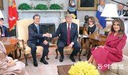 “땡큐”, “고 아웃” 11일(현지시간) 낮 12시 45분, 한미 정상 내외가 만난 미국 워싱턴 백악관의 오벌오피스. 도널드 트럼프 미국 대통령은 지난해 5월 한미 정상회담에 이어 이번에도 한국과 미국 기자들의 질문에 답하는 ‘돌발 기자회견’을 가졌고, 질문이 10개에 달하자 백악관 직원들이 시간이 지났다며 “나가달라”고 요구했다. 이후 청와대는 두 정상의 단독 회담이 낮 12시 10분부터 50분까지 이어졌다고 밝혔다. 문재인 대통령 내외가 낮 12시 10분 백악관에 도착했고, 기자들이 오벌오피스에서 철수한 시간이 낮 12시 45분이었던 점을 감안하면 사실상 두 정상만의 ‘진짜’ 단독 정상회담 시간은 5분 남짓이었던 셈이다. 당초 청와대는 두 정상의 단독 회담이 15분 가량 될 것으로 기대했지만, 기자들의 질문에두 정상이 응하면서 단독 회담 시간이 대폭 줄어들었다. 이어 두 정상은 소규모 회담과 오찬을 겸한 확대 정상회담을 연이어 가졌고, 문 대통령은 오후 2시 17분 경 백악관을 떠났다. 한편 오벌오피스에는 문 대통령의 부인 김정숙 여사와 트럼프 대통령의 부인 멜라니아 여사도 함께 했다. 두 여사는 각 정상의 옆에 앉아 돌발 기자회견을 모두 지켜봤고, 이후 그린룸으로 자리를 옮겨 별도 오찬을 가졌다. 한미 영부인 간 단독 오찬은 1989년 노태우 전 대통령의 부인 김옥숙 여사와 ‘아버지 부시’인 조지 부시 전 대통령의 부인 바버라 여사와의 만남 이후 30년 만이다.워싱턴=한상준 기자 alwaysj@donga.com}