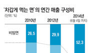 비빔면이 냉면을 꺾고 ‘차갑게 먹는 면’ 분야의 최강자로 떠올랐다. 롯데마트는 냉면과 비빔면, 메밀국수, 쫄면 등의 최근 5년간 매출 구성비를 집계해 9일 발표했다. 이 자료에서는 비빔면이 차갑게 먹는 면의 올해(1월 1일∼6월 4일) 전체 매출에서 가장 높은 비중(52.3%)을 차지한 것으로 나타났다. 롯데마트에서 비빔면이 냉면보다 많이 팔린 것은 최근 5년 중 처음이다. 2위를 차지한 냉면은 전체 매출의 25.7%를 차지하는 데 그쳤다. 롯데마트 관계자는 “냉면은 인스턴트면뿐만 아니라 냉장면 건면 등 다양한 제품으로 출시돼 그동안 부동의 1위 자리를 유지해 왔다”며 “인스턴트 면의 한 종류만 나오는 비빔면이 냉면 매출을 압도한 것은 이례적”이라고 말했다. 비빔면의 상승세는 지난해부터 본격적으로 시작됐다. 2009∼2012년 20%대에 머물렀던 비빔면의 매출 비중은 지난해 38.4%로 급격히 높아졌다. 반면 냉면의 매출 구성비는 점차 하락했다. 2009∼2011년 50%대였던 매줄 비중은 2012년 47.4%로 떨어진 데 이어 지난해 38.7%까지 낮아졌다. 비빔면의 인기는 최근 젊은 층을 중심으로 불기 시작한 ‘모디슈머(Modify+Consumer·여러 제품을 섞어 새로운 음식을 만드는 소비자를 이르는 말)’ 열풍 덕분이다. 한 라면업체 관계자는 “‘골빔면(골뱅이무침+비빔면)’ 등의 조리법이 인기를 끌면서 비빔면의 매출도 덩달아 오른 것”이라고 분석했다. 박진호 롯데마트 인스턴트 상품기획자는 “새로운 제품이 계속 나오고 있어 비빔면의 인기는 계속될 것으로 전망된다”고 말했다.권기범 기자 kaki@donga.com}