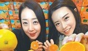 이마트는 하우스 안 온도를 조절해 개화와 수확 시기를 2개월 앞당긴 제주산 가을 밀감을 9일까지 판매한다. 가격은 여름 귤보다 30%가량 저렴한 1.8kg당 1만1900원이다. 3일 오전 서울 용산구 한강로 이마트 용산점에서 모델들이 귤을 들어보이고 있다. 박영대 기자 sannae@donga.com}