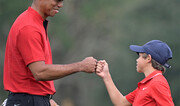 역시 호랑이 아들다웠다. 21일 미국 플로리다주 올랜도의 리츠칼턴 골프클럽(파72)에서 끝난 미국프로골프(PGA)투어 이벤트 대회 PNC 챔피언십의 우승컵은 이틀간 25언더파 119타를 합작한 ‘팀 토머스’(저스틴 토머스와 그의 아버지 마크)에게 돌아갔다. 하지만 스포트라이트는 온통 ‘골프 황제’ 타이거 우즈(45)와 그의 아들 찰리(11)에게 집중됐다. 우즈 부자는 이날 타이거 우즈가 최종 라운드 때 항상 입는 빨간색 셔츠와 검정색 바지를 똑같이 차려 입고 경기에 나섰다. 전날 1라운드에서 생애 첫 이글을 잡아냈던 찰리는 이날도 여러 차례 인상적인 샷을 선보였다. 특히 10번홀(파4)에서는 2m 남짓한 버디 퍼팅을 성공시킨 뒤 주먹을 불끈 쥐며 앞뒤로 흔드는 ‘피스트 펌프’를 선보였다. 아버지와 똑 닮은 세리머니에 언론들도 앞다퉈 이 장면을 소개했다. 이날 10언더파를 적어낸 ‘팀 우즈’는 이틀 동안 20언더파 124타를 합작하며 20개 팀 가운데 7위에 올라 상금 4만7000달러(약 5200만 원)를 받았다. 경기 후 우즈는 “평생 간직할 추억을 만들었다. 찰리와 나 둘 모두에게 특별한 경험이었다”고 말했다. 한편 우즈와 이혼한 찰리의 생모 엘린 노르데그렌이 모처럼 코스에 모습을 드러내 눈길을 끌었다. 노르데그렌은 현재 우즈의 여자 친구인 에리카 허먼과 나란히 서서 경기를 지켜보기도 했다. 이헌재 기자 uni@donga.com}