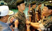 우리나라 군대에서 처음으로 29일 육군 장병 군복에 태극기가 공식 부착됐다. 충남 논산 육군훈련소에서 열린 신병 수료식에서 6·25전쟁 참전용사인 송용호 옹(왼쪽)이 손자인 송봉근 이병의 군복 오른쪽 어깨에 태극기를 달아주고 있다. 육군훈련소는 이날 장병 1724명의 군복에 태극기를 부착했다. 오른쪽은 서상국 육군훈련소장. 논산=양회성 기자 yohan@donga.com}