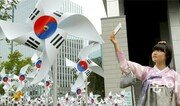 5일 서울 종로구 대한민국역사박물관 앞에 설치된 ‘태극기 바람개비’ 앞에서 한복을 입은 여고생들이 스마트폰으로 셀카를 찍고 있다. 행정자치부는 광복 70주년을 앞두고 이날 청와대와 광화문 일대에 태극기 바람개비를 설치했다. 양회성 기자 yohan@donga.com}