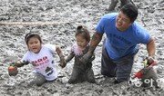 25일 전남 무안에서 열린 ‘무안황토갯벌축제’에 참여한 가족이 무릎까지 빠지는 갯벌에 뛰어들어 농게와 낙지잡기 등 체험을 즐기고 있다. 무안=박영철 기자 skyblue@donga.com}