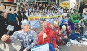 22일 광주 동구 충장로 광주우체국 앞에서 아동 학대와 폭력을 예방하기 위해 광주지방경찰청 경찰관들이 아이언맨, 슈퍼맨 등 영화 속 주인공으로 분장해 퍼포먼스를 하고 있다. 광주경찰청은 국내 최초로 피해 아동을 형상화한 마네킹을 만들어 아동 학대의 인식 전환을 위한 캠페인도 펼치고 있다. 박영철 기자 skyblue@donga.com}