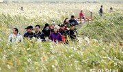 강진만 춤추는 갈대축제가 열린 지난달 30일 전남 강진만을 찾은 관광객들이 은빛 물결로 출렁이는 갈대밭 생태탐방로를 걷고 있다. 올해 처음 선보인 강진만 갈대축제는 남해안 최대 생태서식지로 알려진 강진만에 66만 ㎡(약 20만 평)의 드넓은 바다갈대밭과 2.8km의 생태탐방로가 조성돼 있다. 박영철 기자 skyblue@donga.com}