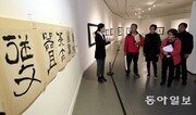 3일 전남 함평군 함평읍 함평군립미술관에서 조선시대 최고 서예가의 한 사람인 추사 김정희 선생의 ‘추사와 선’ 특별전이 열리고 있는 가운데 관람객들이 학예연구사의 작품 설명을 듣고 있다. ‘추사와 선’ 특별기획전은 대자 현판과 서첩 족자의 친필 탁본 30여 점이 전시되며 12월 31일까지 열린다. 박영철 기자 skyblue@donga.com}