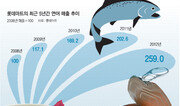 레스토랑에서나 맛보던 ‘고급 수입 수산물’ 연어가 빠르게 대중화되고 있다. 우리나라 사람들의 식습관이 서구형으로 변한 데다 2011년 3월 일본 후쿠시마 원전사고 이후 방사능 오염수에 대한 우려가 커진 것이 주요 원인이다. 연어의 주산지는 일본에서 먼 노르웨이 등 북유럽과 칠레 등 남미 지역이다. 대형마트들은 생선코너의 연어 판촉에 열을 올리고 있으며, 식품업체들은 연어캔 제품을 잇달아 내놓고 있다. 25일 롯데마트에 따르면 최근 5년간 연어 매출은 꾸준히 늘어 왔다. 지난해 연어 매출은 2008년에 비해 2.6배로 늘었다. 올해 9월 셋째 주까지의 매출도 지난해 같은 기간보다 27.5%나 증가했다. 이에 따라 대형마트들은 연어 수입량을 늘리고 판촉 행사를 강화 중이다. 지난해 말부터는 기존의 훈제 연어 이외에 냉장 연어도 수입해 매장에 내놓고 있다. 연어 판매가 늘어나는 것은 우리나라 사람들의 생활문화와 식습관이 서구식으로 변하면서 일반 가정에서도 구이용, 샐러드용 등으로 연어를 자주 찾게 됐기 때문이다. 특히 최근에는 일본 방사능 오염수에 대한 우려가 커지면서 일본에서 먼 곳에서 수입되는 연어 판매량이 더 많이 늘었다. 지난달 롯데마트에서 노르웨이산 연어 판매량이 56.5% 급증할 동안 명태(―66.3%), 고등어(―30.6%), 갈치(―11.8%) 등 다른 생선의 소비는 급감했다. 이처럼 연어의 인기가 치솟자 국내 식품회사들은 잇달아 연어 통조림을 시판해 본격적으로 경쟁에 나서고 있다. 업계에서는 꽁치에서 골뱅이, 참치로 이어졌던 국내 수산물 통조림 시장의 ‘유행 계보’가 연어로 이어지고 있다고 해석한다. 올해 4월 가장 먼저 시장에 나온 CJ제일제당의 ‘알래스카 연어’ 통조림은 소비 불황에도 불구하고 시판 약 6개월 만에 판매금액 100억 원을 돌파했다. 특히 추석 명절용 연어선물세트 판매가 당초 예상보다 호조를 보여 9월 한 달에만 50억 원어치가 팔렸다. 참치캔 대중화를 이끌었던 동원F&B는 연어 통조림을 ‘새로운 국민 통조림’으로 만들기 위해 노력 중이다. 이 회사는 연어 중에서도 고급 어종으로 알려진 칠레산 코호 연어로 만든 ‘동원연어’ 통조림 4종을 이달 10일 내놓았다. 사조해표는 최근 ‘담백한 살코기 연어’ ‘매콤한 고추 연어’ 등을 시판했다. 이 회사는 경쟁사들 대비 약 35%가량 저렴한 가격을 책정해 경쟁력 확보에 나섰다. CJ제일제당의 신나영 브랜드 매니저는 “수산물 통조림 시장에서는 1980년대 참치의 등장 이후 30년간 ‘차세대 주자’가 없었다”며 “최근 건강·웰빙 열풍으로 인기를 끄는 연어가 간편한 캔 형태로 소비자들의 사랑을 받게 되면 관련 시장의 성장 가능성이 무궁무진해질 것”이라고 말했다.박선희·황수현 기자 teller@donga.com}