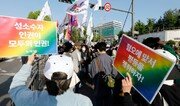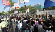 “대통령 집무실이 보이시나요? 여기서부터 최대한 천천히 가겠습니다.” 14일 오후 5시 반경 대통령 집무실이 있는 서울 용산구 국방부 정문 앞. 도보행진 중이던 ‘성소수자차별반대 무지개행동’(무지개행동) 회원 등 500여 명(주최 측 추산)은 사회자가 “새 대통령 집무실 앞을 처음 행진하는 이들이 (바로) 성소수자들”이라고 하자 멈춰선 채 환호했다. 윤석열 대통령 취임 후 첫 주말인 이날 ‘집무실 100m 이내’에서 처음 시위대 행진이 진행됐다. 앞서 경찰은 법적으로 100m 이내 집회가 금지되는 ‘대통령 관저’에 ‘집무실’이 포함되는 것으로 해석하고 이날 행진을 불허했다. 하지만 서울행정법원이 무지개행동이 낸 집행정지 신청을 11일 일부 인용하면서 행진이 예정대로 진행됐다. 무지개행동 등 33개 단체는 이날 오후 3시경 용산역 광장에서 ‘국제 성소수자 혐오 반대의 날 기념대회’를 연 뒤 오후 4시 53분부터 이태원 광장까지 2.5㎞가량 행진했다. 참가자들은 성소수자를 상징하는 무지개 깃발 등을 들고 “차별금지법 제정하라”, “성소수자 인권 교육 실시하라” 등의 구호를 외쳤다. 사회자는 “1962년 집회시위법 제정 이후 시위대가 대통령 집무실 앞을 지나간 적은 없다”며 의미를 부여했다. 청와대에선 집무실과 관저가 인접해 있어 100m 규정이 적용됐다. 이날 행진은 1시간 24분 걸려 “1시간 30분 내에 통과하라”는 법원의 허용 조건을 지켰다. 경찰은 이날 집회에 교통경찰과 기동대를 포함해 수백 명을 투입했다. 선글라스를 쓴 양복 차림의 경찰관들이 2m 간격으로 서서 대통령 집무실 외곽을 지켰고, 사복 차림의 경찰 정보 담당자들은 수시로 무전을 주고받았다. 시위대가 집무실 앞 10m 지점에서 잠시 멈추자 경찰 관계자들은 “빨리 지나가라고 해라” 등의 대화를 나눴다. 경찰은 21일 참여연대가 집무실 인근에서 열겠다고 신고한 집회에 대해서도 금지 통고했다. 서울경찰청 관계자는 “무지개행동 집회 본안소송 판결 전까지 다른 집회에 대해서도 집무실 100m 이내 불허 방침을 유지할 계획”이라고 했다. 이에 대해 참여연대는 집회 금지 처분 취소 소송과 함께 집행정지 신청을 냈다. 조응형 기자 yesbro@donga.com}