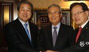 15일 서울 영등포구 여의도의 한 호텔에서 김무성 바른정당 의원(왼쪽), 김종인 전 더불어민주당 대표(가운데), 정의화 전 국회의장이 조찬 회동에 앞서 손을 맞잡고 있다. 김 의원은 회동 직후 “우리나라의 미래를 생각해서는 분권형 개헌이 가장 중요하다는 데 뜻을 같이했다”고 말했다. 김재명 기자 base@donga.com}