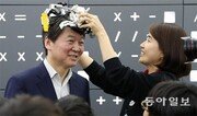 5일 서울 용산구 전자랜드의 창의교육실현 코딩수업 현장을 찾은 국민의당 안철수 전 대표에게 한 관계자가 머리에 쓰면 자동으로 키를 측정해주는 ‘키 재기 로봇’을 씌워주고 있다. 김재명 기자 base@donga.com}