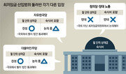 최저임금 산입범위 확대를 두고 더불어민주당과 여권의 우군(友軍)인 노총이 충돌 양상을 보이고 있다. 노동계 출신인 더불어민주당 홍영표 원내대표는 “민노총은 너무 고집불통”이라며 국회에서 산입범위를 확대한 최저임금법 처리를 공언했다. 최저임금 산입범위 확대 논의를 국회가 아닌 최저임금위원회로 넘겨 달라는 양대 노총의 요구를 거절한 것이다. 이에 민노총은 “노사정 대표자 회의와 경제사회노동위원회의 어떤 회의에도 참여하지 않겠다”며 노사정 대화에 복귀한 지 4개월 만에 강경 투쟁으로 돌아섰다.○ “8개월 끈 최저임금위에 다시 못 넘겨” 국회 환경노동위원회 고용노동소위원회는 최저임금 산입범위를 두고 22일 새벽까지 밤샘토론을 이어갔지만 결국 합의를 이루지 못했다. 주요 쟁점은 매월 정기적, 일률적으로 지급되는 통상성 임금(정기 상여금)과 숙식비, 교통비 등 복리후생비를 최저임금에 포함할지 여부다. 최저임금 산입범위란 최저임금에 편입하는 임금 항목이다. 경영계는 최저임금 산입범위를 넓혀 최저임금 인상에 따른 충격을 완화해 달라고 요구하고 있다. 반면 한국노총과 민노총 등 양대 노총은 정기 상여금 등을 최저임금에 포함하면 최저임금 인상 효과가 반감된다며 반발하고 있다. 이 때문에 최저임금위는 산입범위 확대를 두고 결론을 내지 못했고, 결국 공은 국회로 넘어왔다. 그럼에도 양대 노총이 다시 산입범위 논의를 최저임금위로 넘기라고 요구하고 나선 것이다. 이달 중순까지 국회 환노위원장을 맡은 홍 원내대표는 더 이상 논의를 공전시킬 수 없다며 국회에서 매듭짓겠다는 입장이다. 홍 원내대표는 22일 0시경 국회 환노위 회의실 복도에서 김경자 민노총 수석부위원장과 공개 설전을 벌이기도 했다. 김 부위원장이 “최저임금위로 논의를 넘겨주면 6월 안에 논의를 끝낼 수 있다”고 말하자 홍 원내대표는 “8개월 동안 논의를 끌어놓고 지금 와서 논의할 시간을 또 달라는 거냐”며 거절 의사를 분명히 했다. “논의를 무산시키기 위한 지연작전 아니냐”는 것이다. 이에 김 부위원장이 “너희(노동계)는 할 수 없고 우리(국회)만 할 수 있다고 말하는 것은 오만”이라고 언성을 높이자 홍 원내대표는 “민노총은 너무 고집불통이다. 양보할 줄 모른다”고 맞받아쳤다. 홍 원내대표는 1990년 대우그룹 노조 사무처장과 대기업 노조연대회의 사무처장을 지낸 노동계 출신이다. 환노위는 24일 최저임금 산입범위 문제를 재논의하기로 했다. 민주당과 자유한국당은 정기 상여금을 산입범위에 포함하는 데 큰 틀에서 합의한 상태다. 반면 ‘평화와 정의의 의원모임’ 간사인 정의당 이정민 의원은 노동계 입장을 대변하고 있다. 결국 24일에도 합의가 이뤄지지 않으면 표결 처리 가능성도 있다. 민주당 간사인 한정애 의원은 “(합의가 안 될 경우) 표결도 할 수 있다”며 “19대 국회 때도 표결은 아니지만 2, 3명 정도 반대해 이를 소수의견으로 기재하고 처리한 적이 있다”고 밝혔다.○ 경제단체끼리도 의견 충돌 현재 양대 경제단체인 한국경영자총협회(경총)와 중소기업중앙회(중기중앙회)의 입장도 엇갈리면서 논의는 한층 복잡한 상황이다. 경총은 22일 새벽 긴급 보도자료를 내 “정기 상여금은 노조가 없는 기업의 경우 회사가 상여금 지급 주기를 (매월로) 변경하는 게 가능하지만 노조가 있는 기업은 단체협약 개정을 위해 노조의 동의가 필요해 산입범위 확대가 사실상 불가능해진다”며 “국회 논의는 실질적인 효과가 없기 때문에 국회가 아닌 최저임금위에서 논의해야 한다”고 밝혔다. 목표는 다르지만 국회 통과를 저지하기 위해 전술적으로 양대 노총과 손을 잡겠다는 것이다. 반면 중기중앙회는 최저임금심의위 공익위원 대부분이 친노동계 인사임을 감안해 최저임금위에서 산입범위를 조정하는 것에 강력 반대하고 있다. 대부분의 중소기업은 상여금이 적은 대신 숙식비와 교통비 등 복리후생비 부담이 더 큰 상황이어서 이를 반영한 국회 논의 안이 빨리 통과되길 바라는 것이다. 민노총은 이날 “앞으로 노동 현안을 투쟁으로 쟁취하겠다”고 선언했다. 한국노총은 23일 국회 앞에서 최저임금 산입범위 조정 저지를 위한 결의대회를 열겠다고 예고했다.조건희 becom@donga.com·변종국·김성규 기자}