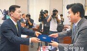 남북 고위급 접촉 타결 이후 새누리당 김무성 대표와 새정치민주연합 문재인 대표의 행보가 엇갈리고 있다. 김 대표는 내년 총선 공천규칙을 놓고 ‘집안 단속’에 나선 반면 문 대표는 외교 행보로 보폭을 넓히고 있다. 김 대표는 26일 충남 천안시 우정공무원교육원에서 열린 의원 연찬회에서 오픈프라이머리(완전국민경선제)에 대한 친박(친박근혜)계의 회의적인 반응에 쐐기를 박았다. ‘국민공천제 관철’ 등을 담은 결의문을 채택한 뒤 이어진 비공개 토론에서 의원들의 견해를 재차 확인한 결과 이견이 없었다는 점을 분명히 한 것이다. 김 대표는 “의원들에게 ‘(오픈프라이머리를) 당론으로 확정했는데 지금 뜻이 바뀐 분 계십니까’라고 물어봤다”며 “한 사람도 손을 안 들어서 ‘그 뜻을 그대로 관철해야 되지 않겠느냐’고 하니 모두 박수로 인정해줬다”고 말했다. 이어 “당론으로 확정된 국민공천제를 그대로 강력하게 추진하기로 결정했다”고 강조했다. 문 대표는 이날 추궈훙(邱國洪) 주한 중국대사와 마크 리퍼트 주한 미국대사를 국회로 초청해 차례로 면담하며 6자회담 재개를 요청했다. 이에 대해 추 대사는 “(미국과 북한) 양측이 받아들일 수 있는 방안을 마련하도록 노력하겠다”고 말했다고 김성수 대변인이 전했다. 리퍼트 대사의 발언은 미 대사관 측이 비공개를 요청했다. 앞서 16일 문 대표는 ‘한반도 신경제지도’ 구상을 밝히며 “미국과 중국을 설득해 북한을 대화의 장으로 이끌어내야 한다”고 강조했다. 문 대표는 이날 ‘한반도 신경제지도’ 내용이 담긴 영문책자를 양(兩) 대사에게 직접 전달하기도 했다. 전날 문 대표는 10월 중순 방중 계획을 밝혔다. 이를 놓고 당 일각에서는 “문 대표가 혁신위원회 활동 종료 이후 제기될 ‘분당론’과 ‘문 대표 책임론’ 등을 돌파할 수 있다는 자신감을 표명한 것 아니냐”는 해석도 나온다.홍수영 기자 gaea@donga.com황형준 기자 constant25@donga.com}