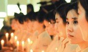 손에 올린 촛불이 파르르 떤다. 눈빛도 입술도 심장도 이 촛불처럼 떨린다. 간호사로서 사랑과 봉사를 실천한다고 맹세하는 시간. 1850년대 크림전쟁 당시 등불을 들고 환자를 돌본 나이팅게일처럼…. 희생정신을 언약하는 이들의 눈빛에 진짜 간호사의 미래가 그려지고 있다.―7일 서울 동작구 흑석동 중앙대에서 열린 간호학과 3학년 학생 73명의 ‘나이팅게일 선서식’신원건 기자 laputa@donga.com}