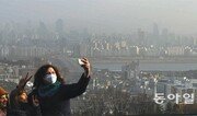설 연휴 마지막 날인 22일 오후 서울 남산을 찾은 외국인 관광객들이 황사가 짙게 낀 서울 시내를 배경으로 사진을 찍고 있다. 이날 영남과 제주도를 제외한 전국 대부분 지역에 황사특보가 발효된 가운데 23일에는 황사가 전국으로 확대될 것으로 기상청은 예보했다.양회성 기자 yohan@donga.com}