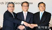 11일 서울 중구 웨스틴조선호텔에서 열린 제10차 한중일 고위급 회의에 앞서 이경수 외교부 차관보(가운데)와 스기야마 신스케 일본 외무성 외무심의관(왼쪽), 류전민 중국 외교부 부부장이 손을 맞잡고 기념촬영을 하고 있다. 3국 대표는 이날 2012년 4월 이후 열리지 못한 한중일 외교장관회의를 21일 서울에서 열기로 한 것으로 알려졌다. 양회성 기자 yohan@donga.com}