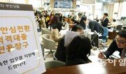 중도상환 수수료 없이 변동금리 대출을 연 2%대 중반의 고정금리 대출로 갈아탈 수 있는 안심전환대출이 24일 출시돼 고객들의 높은 관심을 끌고 있다. 정부가 월간 대출전환 한도를 5조 원으로 정했는데 이날 하루에만 2만6877건, 3조3036억 원이 안심전환대출로 전환됐다. 국민은행 서울 여의도지점에서 고객들이 안심전환대출 이용 상담을 받고 있다. 양회성 기자 yohan@donga.com}