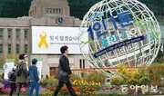 세월호 참사 1주년(4월 16일)을 사흘 앞둔 13일 노란 리본과 함께 (세월호의 아픔을) ‘잊지 않겠습니다’는 문구가 걸린 서울도서관(옛 서울시청) 앞을 시민들이 지나고 있다. 그 앞으로 서울광장에 놓인 지구본 모양의 조형물은 ‘온실가스 1인 1톤 줄이기’ 홍보를 위해 환경부가 설치한 것으로 5월 10일까지 이곳에 전시되고, 이후로는 전국의 주요 도시를 돌며 전시될 예정이다.양회성 기자 yohan@donga.com}