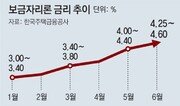 미국발 고강도 긴축 충격으로 정책 금융 상품을 이용하는 서민들의 이자 부담이 크게 늘고 있다. 시중은행 금리도 덩달아 치솟아 2008년 금융위기 이후 14년 만에 대출금리 연 8% 시대가 올 것이라는 전망이 나온다. 19일 금융권에 따르면 대표적 정책 모기지 상품인 보금자리론 금리는 이달 연 4.25∼4.60%가 적용된다. 지난달 연 4.00∼4.40%로 7년 11개월 만에 4%를 돌파한 데 이어 이달 또 올랐다. 보금자리론은 6억 원 이하 주택을 구매하는 연 소득 7000만 원 아래 무주택자에게 나오는 대출로, 서민들에게 ‘내 집 마련 사다리’로 불린다. 이 조건에 해당되면 3억6000만 원까지 최대 40년간 고정금리로 빌릴 수 있다. 보금자리론 금리가 오르면서 이와 연동되는 안심전환대출 금리도 5%대 진입을 앞두게 됐다. 안심전환대출은 금융기관의 고금리·변동금리 주담대 대출을 저금리·고정금리로 바꿔주는 정책 금융 상품이다. 금리는 보금자리론 금리보다 0.3%포인트 낮게 정해진다. 9억 원 이하 아파트에 대해 최대 5억 원을 장기 고정금리로 빌려주는 적격대출의 금리도 연 4.6%까지 올랐다. 올 초까지만 해도 3%대 금리로 완판 행렬을 이어갔지만 최근 상황이 크게 바뀐 것이다. 적격대출의 금리는 올 들어서만 1.20%포인트 올랐다. 정책 금융 상품의 금리가 빠르게 오르는 것은 미 연방준비제도(Fed·연준)의 긴축으로 국고채 금리가 급등하고 있기 때문이다. 앞서 17일 보금자리론과 적격대출 금리의 기준이 되는 국고채 5년물 금리는 연 3.855%에 마감했다. 2011년 8월 4일(연 3.90%) 이후 최고치다. 국고채 금리 상승세는 점점 더 가팔라지고 있어 다음 달 정책 금융 상품 금리도 더 올라갈 것이라는 전망이 나온다. 국고채 금리 상승은 시중은행의 대출 금리도 끌어올리고 있다. 17일 기준 KB국민 신한 하나 우리은행 등 4대 시중은행의 혼합형(고정형) 주담대 금리는 연 4.330∼7.140%로 집계됐다. 16일 최대 연 7.090%로 7%대를 돌파한 후에도 하루 새 0.05%포인트 올랐다. 변동형 주담대 금리도 연 3.690∼5.681%로 6%대를 목전에 두고 있다. 한국은행이 올해 하반기(7∼12월)에 기준금리를 1%포인트 내외 더 올릴 것으로 예상돼 올해 고정형 주담대 금리 상단도 연 8%대를 돌파할 것이 확실시된다. 이렇게 되면 2008년 금융위기 이후 처음으로 주담대 8% 시대가 열리는 것이다. 금융권 관계자는 “금리가 연 8% 수준으로 치솟으면 ‘영끌(영혼까지 끌어모아 대출)족’의 이자 부담은 지금보다 30%가량 늘어나게 될 것”이라고 했다.송혜미 기자 1am@donga.com}
