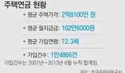 주택연금 가입자의 평균 연령은 72세로 월 평균 103만 원을 받는 것으로 나타났다. 주택금융공사는 2007년 7월 주택연금이 출시된 후 올해 6월 말까지 총 1만4866명이 가입했다고 23일 밝혔다. 주택연금은 주택을 담보로 맡기고 사망할 때까지 연금을 받는 제도다. 도입 첫해에는 831명이 가입했으나 지난해에는 5201명으로 급증할 정도로 인기를 끌고 있다.주택연금 가입자로는 70대가 49.6%로 가장 많았고 60대 이하는 35.2%, 80대 이상은 15.2%였다. 이들이 매달 받는 연금액은 50만 원∼100만 원 미만이 41.8%를 차지했다. 100만 원∼150만 원 미만(21.1%), 50만 원 미만(18.6%), 150만 원∼200만 원 미만(9.7%), 200만 원∼300만 원 미만(6.6%) 순이었다. 가입한 주택 가격은 1억 원∼2억 원 미만이 30.3%로 가장 많았고 2억 원∼3억 원 미만(25.2%), 3억 원∼4억 원 미만(16.1%)이 뒤를 이었다. 주택연금은 출시 당시에는 부부 모두 65세 이상이면서 6억 원 이하 주택 소유자만 가입할 수 있었지만 지금은 60세 이상, 9억 원 이하 주택 소유자도 가입할 수 있다.신수정 기자 crystal@donga.com}