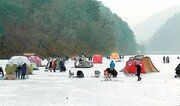 10일 강원 춘천시 서면 오월리 하천 얼음판 위에서 관광객들이 빙어 낚시와 썰매를 즐기고 있다. 얼음낚시 중심의 강원 겨울축제들이 신종 코로나바이러스 감염증(코로나19) 여파로 연이어 취소되면서 출입이 가능한 얼음낚시터에 많은 이들이 몰릴 것으로 보인다.이인모 기자 imlee@donga.com}