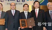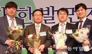 6일 서울 중구 한국프레스센터에서 열린 2016년 한국신문상 시상식에서 ‘김무성 새누리당 대표 사위의 마약투약 사건 수사 및 재판 봐주기 의혹’ 보도로 뉴스취재보도 부문 상을 받은 동아일보 사회부 기자들과 황호택 한국신문방송편집인협회장(동아일보 논설주간)이 기념촬영을 하고 있다. 왼쪽부터 조동주 기자, 황호택 협회장, 장관석 신동진 기자. 김재명 기자 base@donga.com}