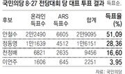 국민의당 새 대표로 안철수 전 대선 후보가 선출됐다. 5·9대선에서 패배한 이후 정치적 동면기를 보낸 지 110일 만이다. 안 전 후보는 새정치민주연합(현 더불어민주당)과 국민의당 공동대표를 지냈지만 선거를 거쳐 당 대표로 선출된 것은 이번이 처음이다. 국민의당은 27일 오후 국회 의원회관에서 대표 등 지도부 선출을 위한 전당대회를 열었다. 온라인 투표와 자동응답시스템(ARS) 투표에 참여한 유권자 5만6953명 중 안 후보는 2만9095명(51.09%)의 과반 지지를 얻어 결선 투표 없이 곧바로 당 대표에 올랐다. 2위는 28.36%를 얻은 정동영 후보(1만6151명), 3위는 천정배 후보(9456명·16.60%), 4위는 이언주 후보(2251명·3.95%)였다. 이날 2명이 선출된 최고위원에는 박주원 전 경기 안산시장과 장진영 전 대한변협 대변인이 선출됐다. 여성위원장에는 현역 비례대표인 박주현 의원이, 청년위원장에는 안 대표의 비서 출신인 이태우 후보가 뽑혔다. 안 대표는 대표 수락 연설에서 “안철수가 다시 국민 속으로 뛰도록 정치적 생명을 주셨다”며 “다시 실망 드리는 일은 없을 것이다”라고 말했다. 그는 “(한명숙 전 총리의) 대법원 판결까지 부정하며 큰소리를 치는 모습에서 벌써 독선에 빠진 권력의 모습, (살충제 계란 파문에서) 그들만의 코드인사가 부른 오만함이 보인다. 독선과 오만은 더 기승을 부릴 것”이라며 문재인 정부를 겨냥했다. 이어 “국민이 쳐다보는 곳을 같이 바라보는 정당이 될 것”이라며 “실천적 중도개혁정당이라는 분명한 정체성을 확립해 나갈 것이다”라고 말했다.장관석 jks@donga.com·최고야 기자}